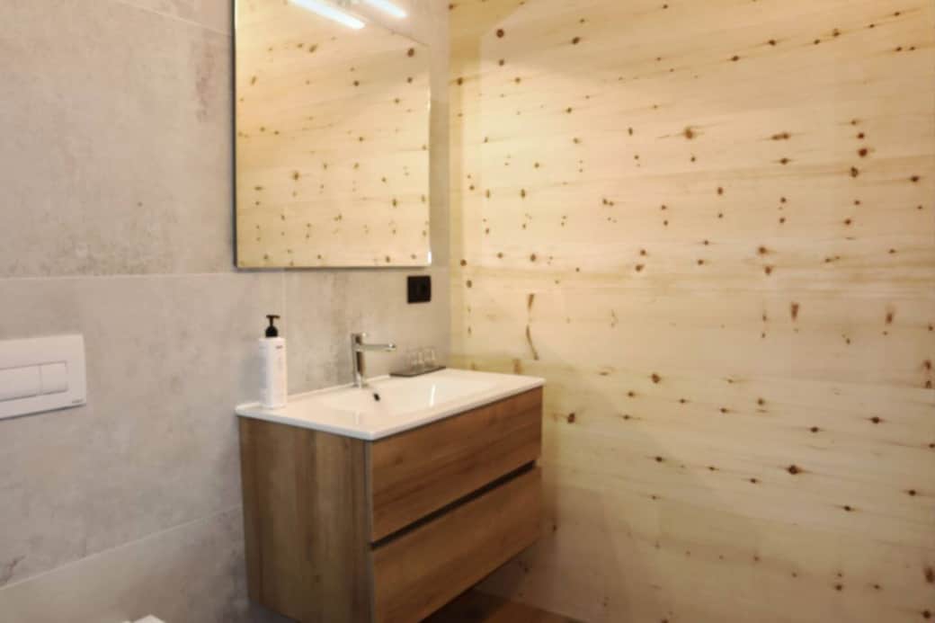 Das Mini-Apartment Zirum verdankt seinen Namen dem ladinischen Wort „Zirbelkiefer“, einem kostbaren und duftenden Holz, das typisch für die Dolomiten ist. Möbel, Küche und Bett sind aus Zirbe gefertigt und schaffen so eine warme, natürliche und entspannende Atmosphäre.